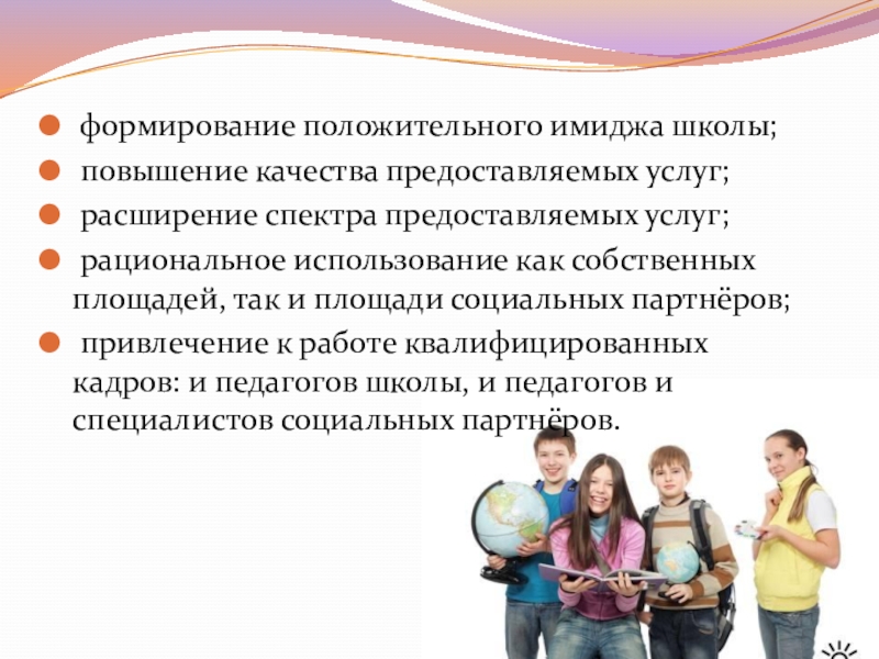 формирование положительного имиджа школы; повышение качества предоставляемых услуг; расширение спектра предоставляемых услуг; рациональное использование как собственных