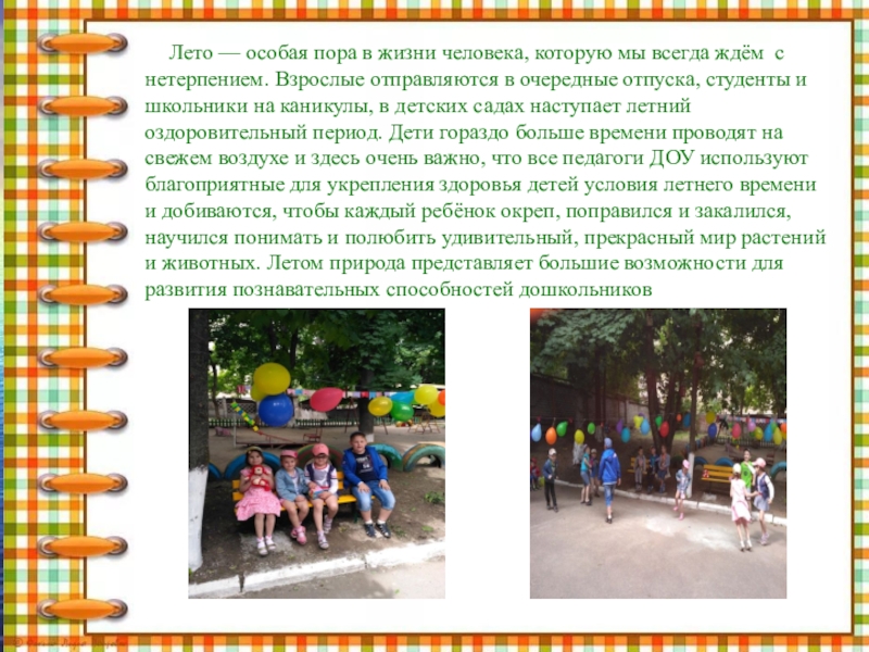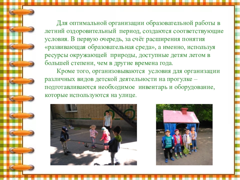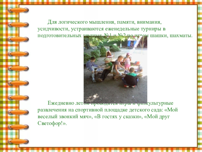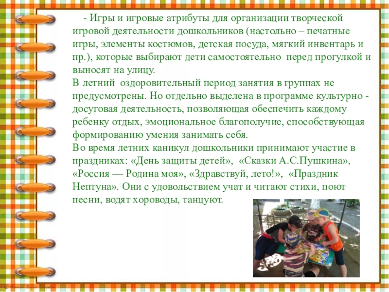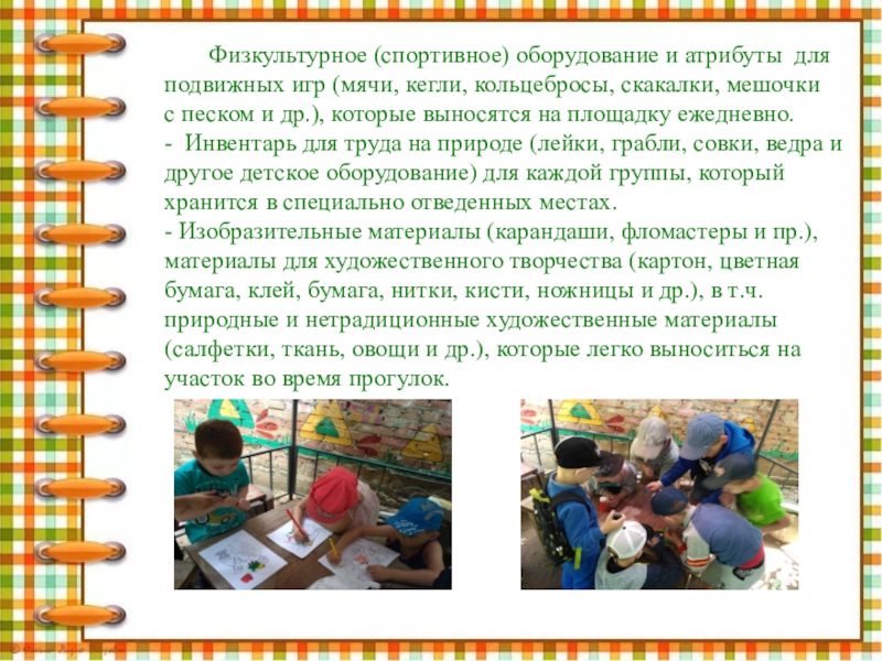 скакалки, мешочки с песком и др.), которые выносятся на площадку ежедневно.