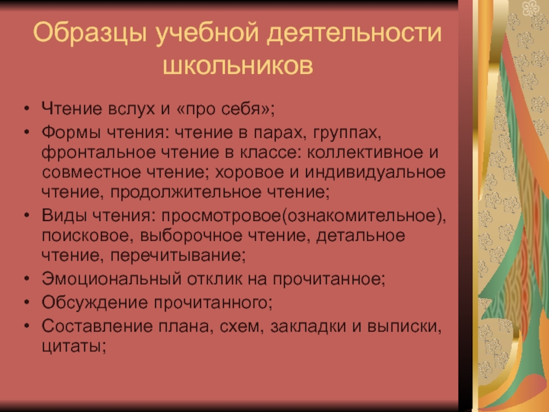Виды чтения: просмотровое(ознакомительное), поисковое, выборочное чтение, детальное чтение, перечитывание;