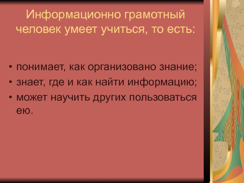 Слайд 6Информационно грамотный человек умеет учиться, то есть: