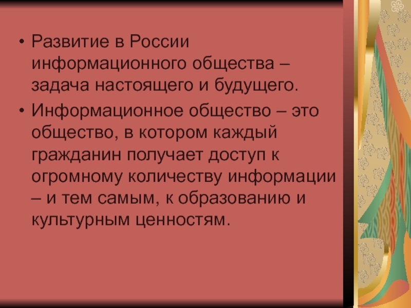 Слайд 3Развитие в России информационного общества – задача настоящего и будущего.