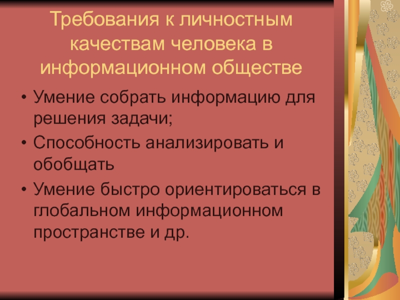 Слайд 4Требования к личностным качествам человека в информационном обществе