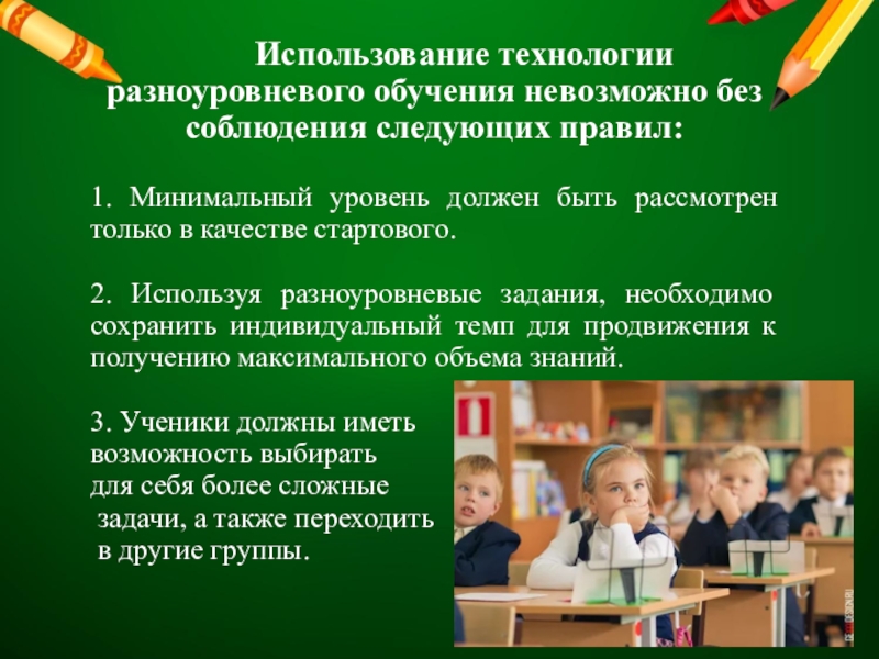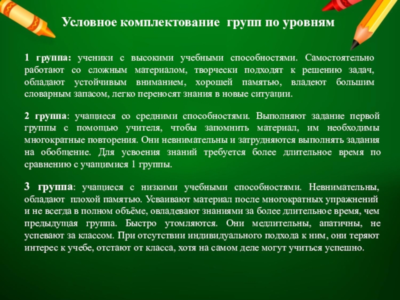 3 группа: учащиеся с низкими учебными способностями. Невнимательны, обладают плохой памятью. Усваивают материал после многократных упражнений и не всегда в полном объёме, овладевают знаниями за более длительное время, чем предыдущая группа. Быстро утомляются. Они медлительны, апатичны, не успевают за классом. При отсутствии индивидуального подхода к ним, они теряют интерес к учебе, отстают от класса, хотя на самом деле могут учиться успешно.