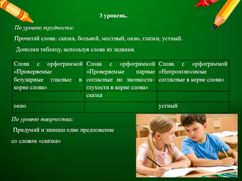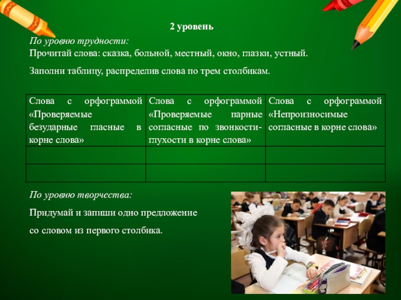 По уровню творчества: Придумай и запиши предложения с каждым из придуманных слов.