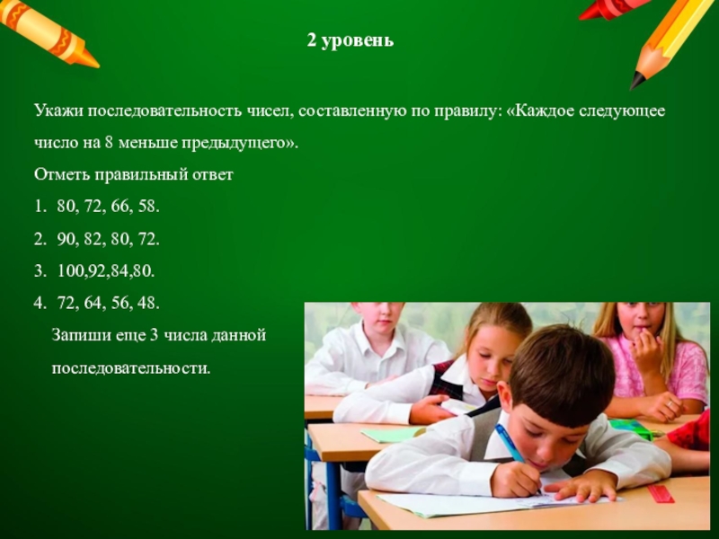 2 группа: учащиеся со средними способностями. Выполняют задание первой группы с помощью учителя, чтобы запомнить материал, им необходимы многократные повторения. Они невнимательны и затрудняются выполнять задания на обобщение. Для усвоения знаний требуется более длительное время по сравнению с учащимися 1 группы.