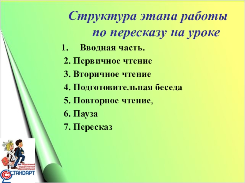 Слайд 21Структура этапа работы по пересказу на уроке