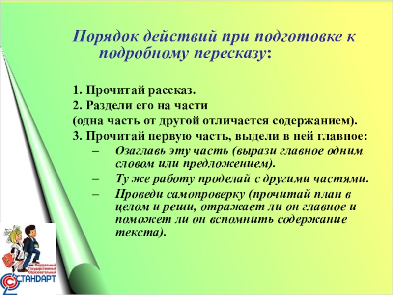 Слайд 17Порядок действий при подготовке к подробному пересказу: