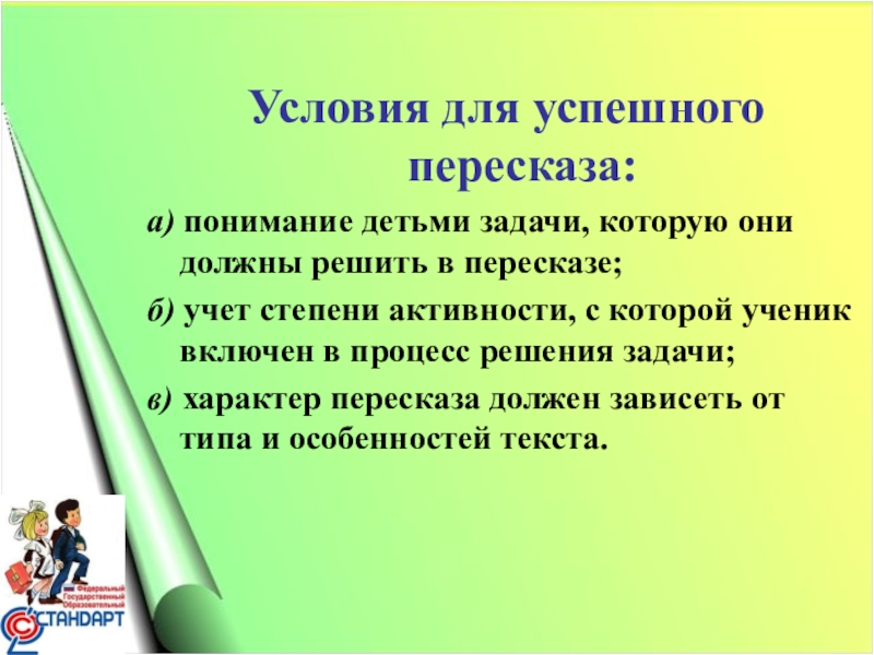 Слайд 12Условия для успешного пересказа: