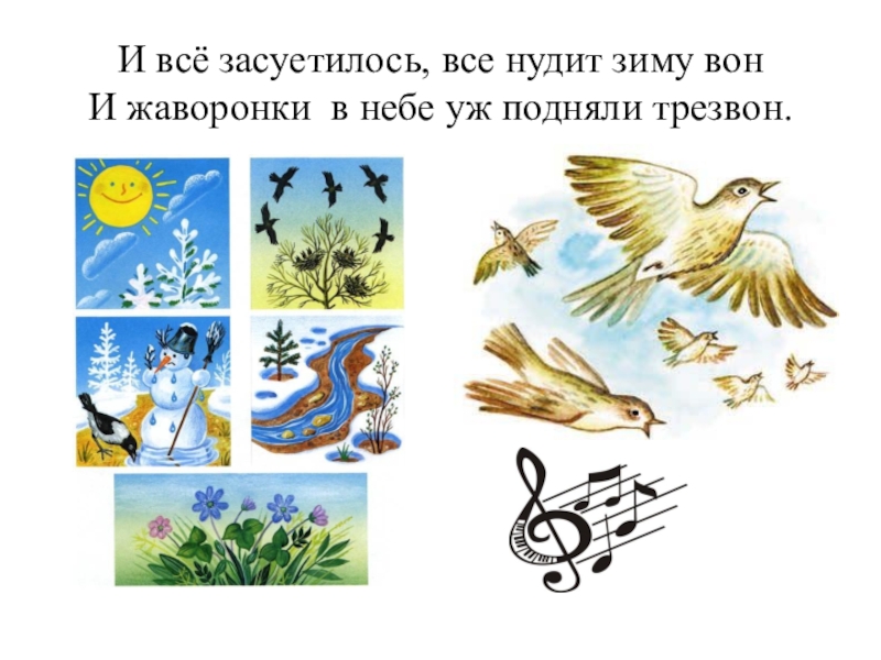 Слайд 9И всё засуетилось, все нудит зиму вон И жаворонки в небе уж