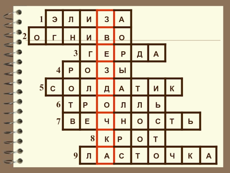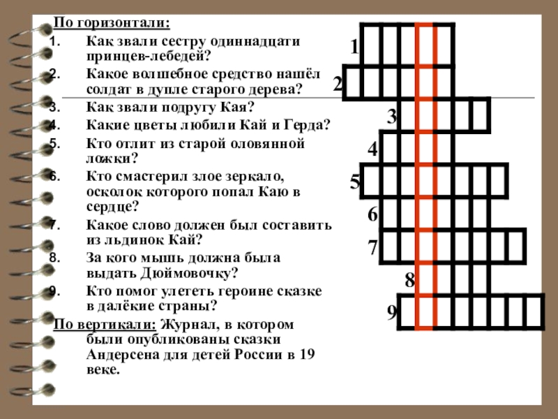 По вертикали: Журнал, в котором были опубликованы сказки Андерсена для детей России в 19 веке.