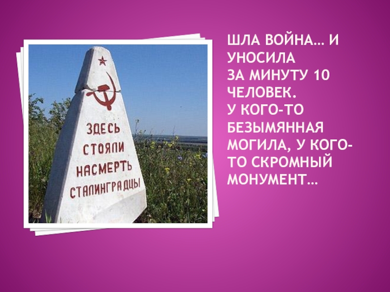 Слайд 6Шла война… и уносила за минуту 10 человек. У кого-то безымянная