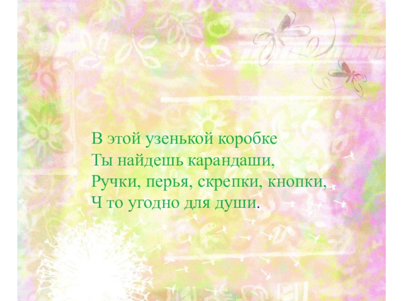 В этой узенькой коробкеТы найдешь карандаши,Ручки, перья, скрепки, кнопки,Ч то угодно для души.