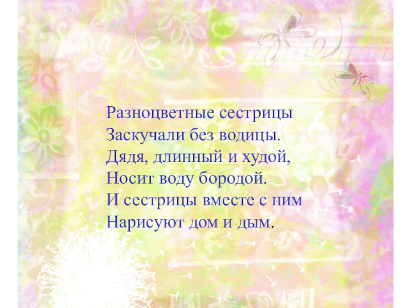 Слайд 14Разноцветные сестрицы Заскучали без водицы. Дядя, длинный и худой, Носит воду бородой. И сестрицы вместе