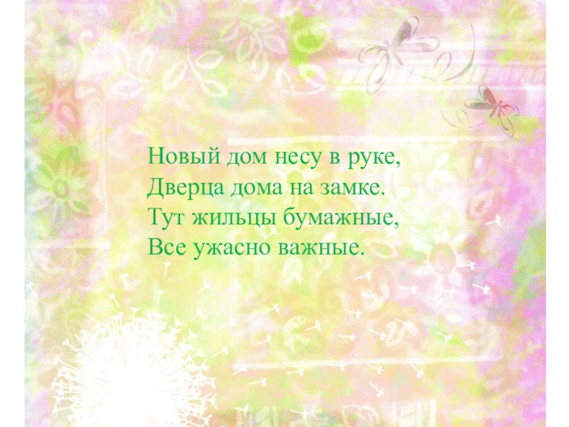 Новый дом несу в руке, Дверца дома на замке. Тут жильцы бумажные,  Все ужасно важные.