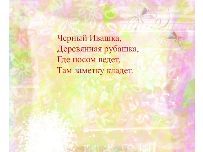 Слайд 8Черный Ивашка, Деревянная рубашка, Где носом ведет, Там заметку кладет.