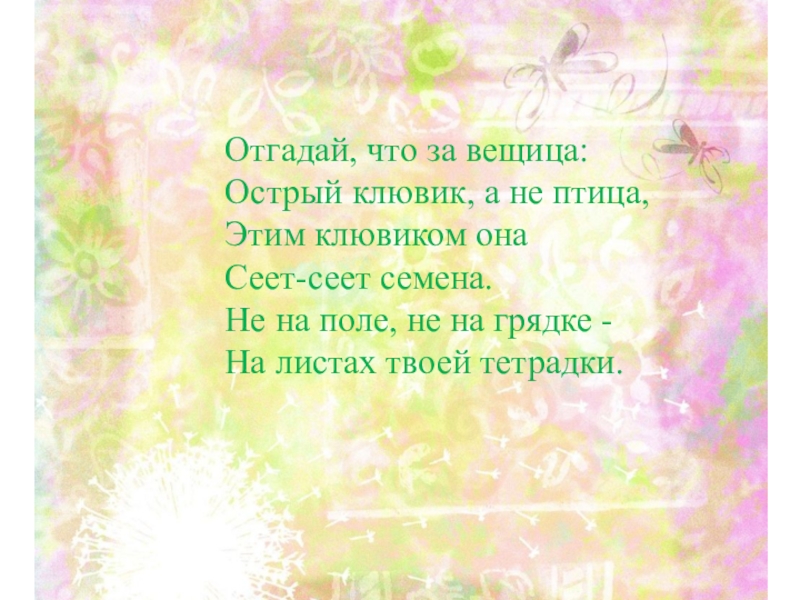Отгадай, что за вещица: Острый клювик, а не птица, Этим клювиком она Сеет-сеет семена.Не на поле, не