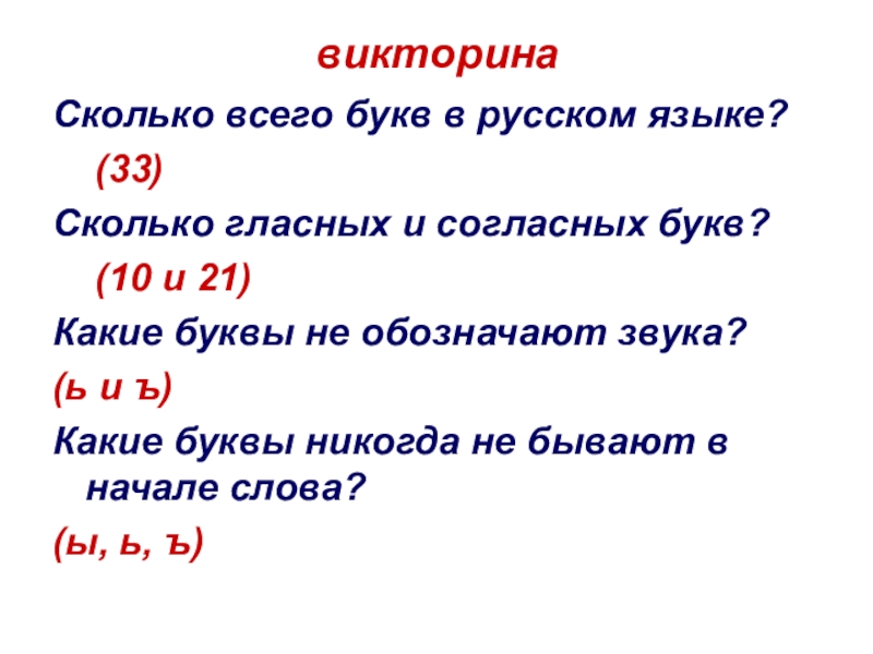 викторинаСколько всего букв в русском языке?   (33)Сколько гласных и согласных букв?  (10 и 21)Какие