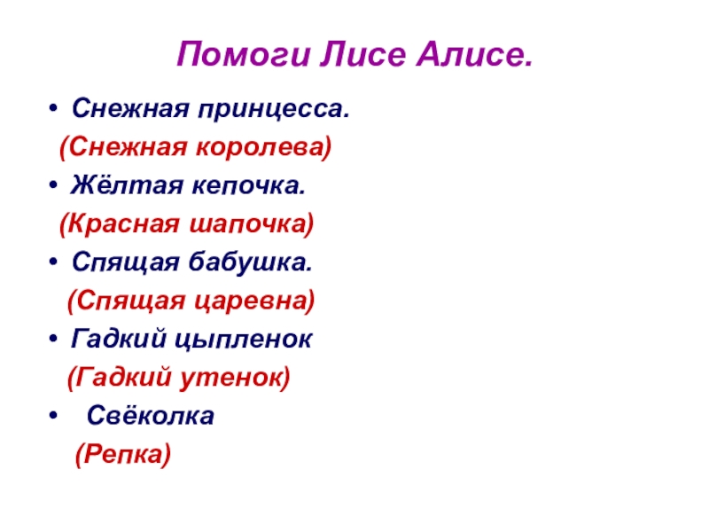 Помоги Лисе Алисе.Снежная принцесса. (Снежная королева)Жёлтая кепочка. (Красная шапочка)Спящая бабушка.  (Спящая царевна)Гадкий цыпленок  (Гадкий утенок)