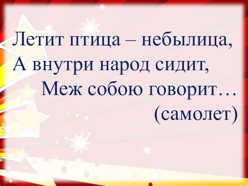 Летит птица – небылица,А внутри народ сидит, Меж собою говорит… (самолет)