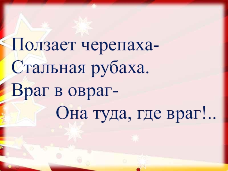 Ползает черепаха-Стальная рубаха.Враг в овраг-Она туда, где враг!..