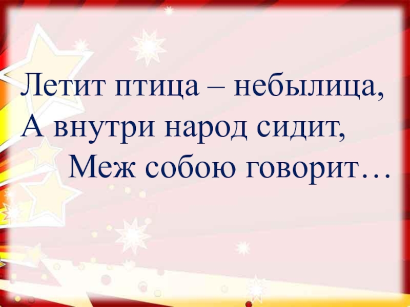 Летит птица – небылица,А внутри народ сидит, Меж собою говорит…
