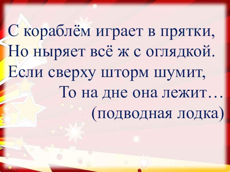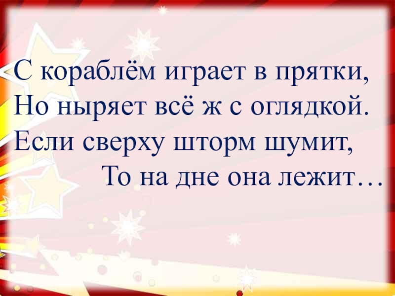 С кораблём играет в прятки,Но ныряет всё ж с оглядкой.Если сверху шторм шумит,То на дне она лежит…