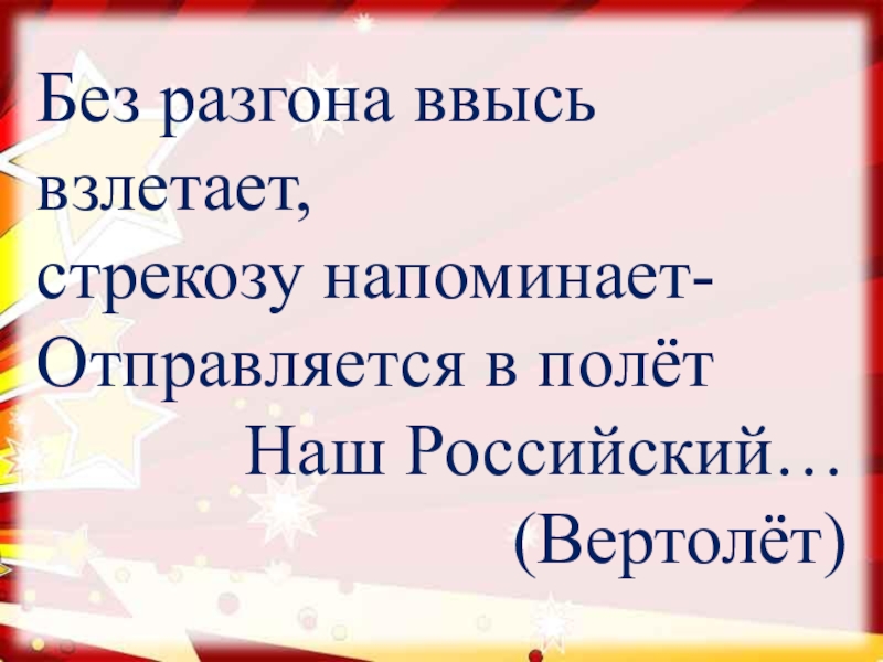 Без разгона ввысь взлетает, стрекозу напоминает-Отправляется в полётНаш Российский… (Вертолёт)
