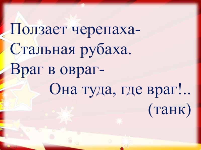 Ползает черепаха-Стальная рубаха.Враг в овраг-Она туда, где враг!.. (танк)