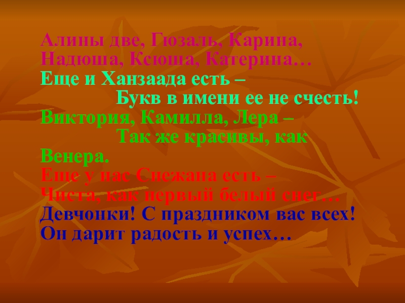 Букв в имени ее не счесть! Виктория, Камилла, Лера – Так же красивы, как Венера. Еще у нас Снежана есть – Чиста, как первый белый снег… Девчонки! С праздником вас всех! Он дарит радость и успех…