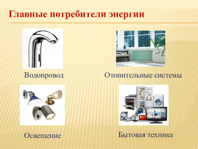 Главные потребители энергии ВодопроводОтопительные системыОсвещение Бытовая техника
