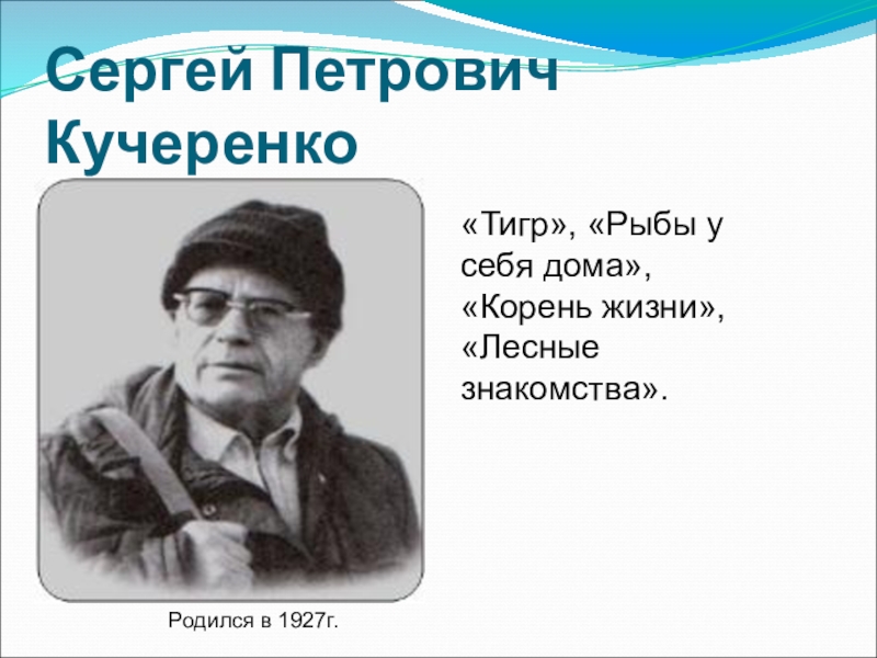 Сергей Петрович КучеренкоРодился в 1927г.«Тигр», «Рыбы у себя дома», «Корень жизни»,«Лесные знакомства».
