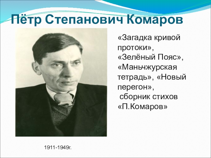 Пётр Степанович Комаров 1911-1949г.«Загадка кривой протоки», «Зелёный Пояс», «Маньчжурская тетрадь», «Новый перегон», сборник стихов «П.Комаров»