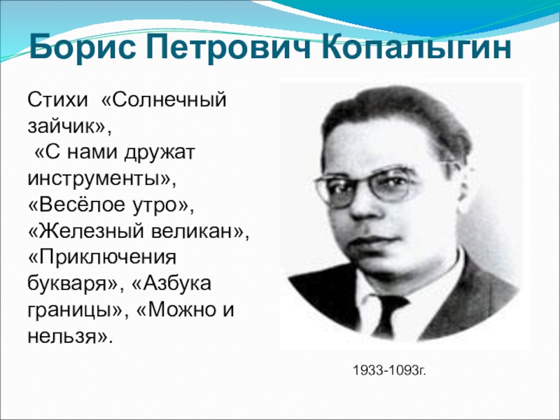 Борис Петрович Копалыгин 1933-1093г.Стихи «Солнечный зайчик»,  «С нами дружат инструменты», «Весёлое утро», «Железный великан», «Приключения букваря»,