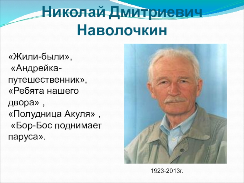 Николай Дмитриевич Наволочкин 1923-2013г.«Жили-были», «Андрейка-путешественник»,«Ребята нашего двора» , «Полудница Акуля» , «Бор-Бос поднимает паруса».