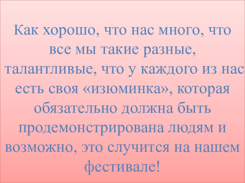 Как хорошо, что нас много, что все мы такие разные, талантливые, что у каждого из нас есть своя «изюминка», которая обязательно должна быть продемонстрирована людям и возможно, это случится на нашем фестивале!