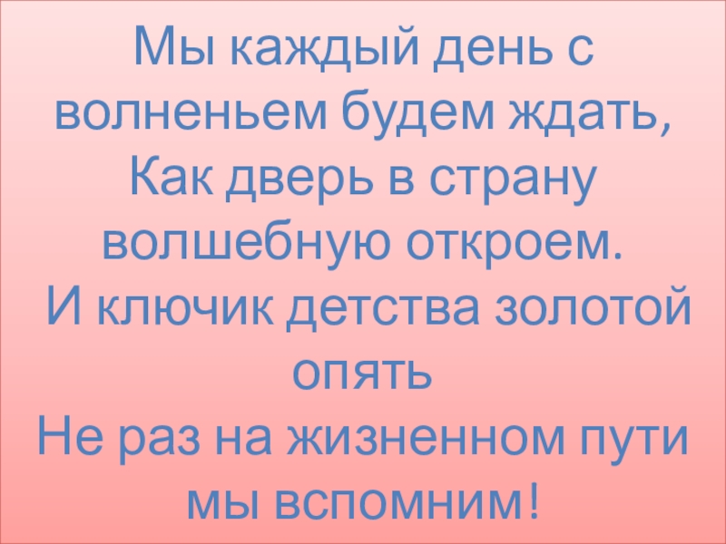 Мы каждый день с волненьем будем ждать,  Как дверь в страну волшебную откроем.  И ключик