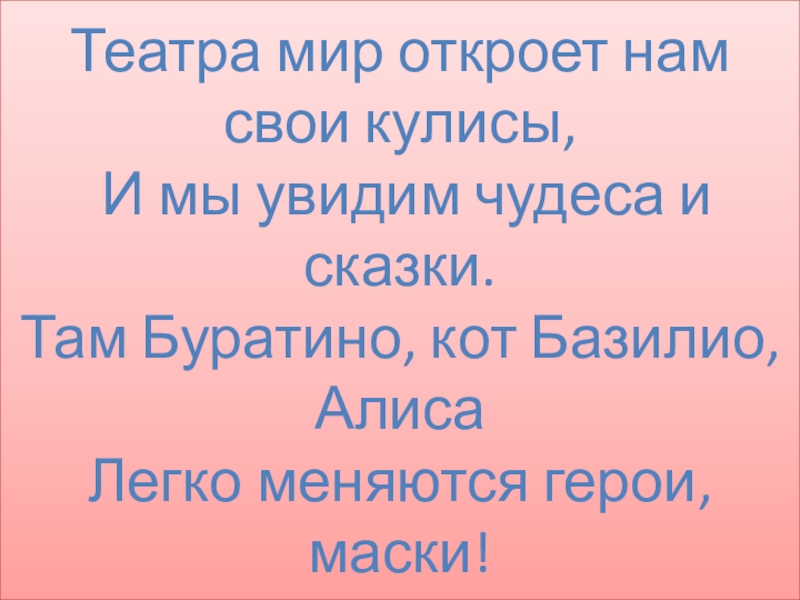 Театра мир откроет нам свои кулисы,  И мы увидим чудеса и сказки.  Там Буратино, кот
