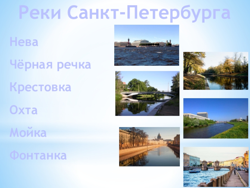 Реки Санкт-ПетербургаНеваЧёрная речкаКрестовкаОхтаМойкаФонтанка