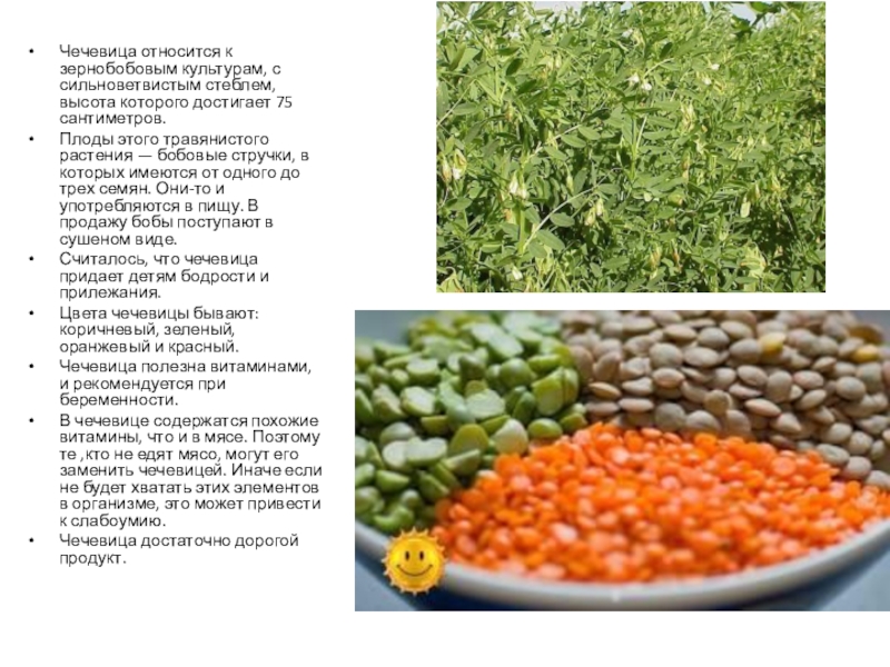 Чечевица относится к зернобобовым культурам, с сильноветвистым стеблем, высота которого достигает 75 сантиметров.Плоды этого травянистого растения —