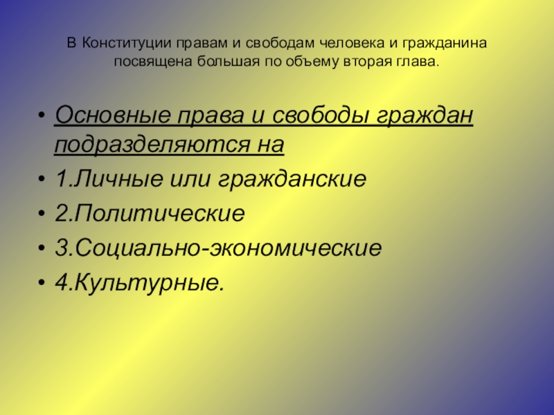 - представление о конституционных правах и свободах человека и гражданина и о проблемах их реализации в реальной жизни;