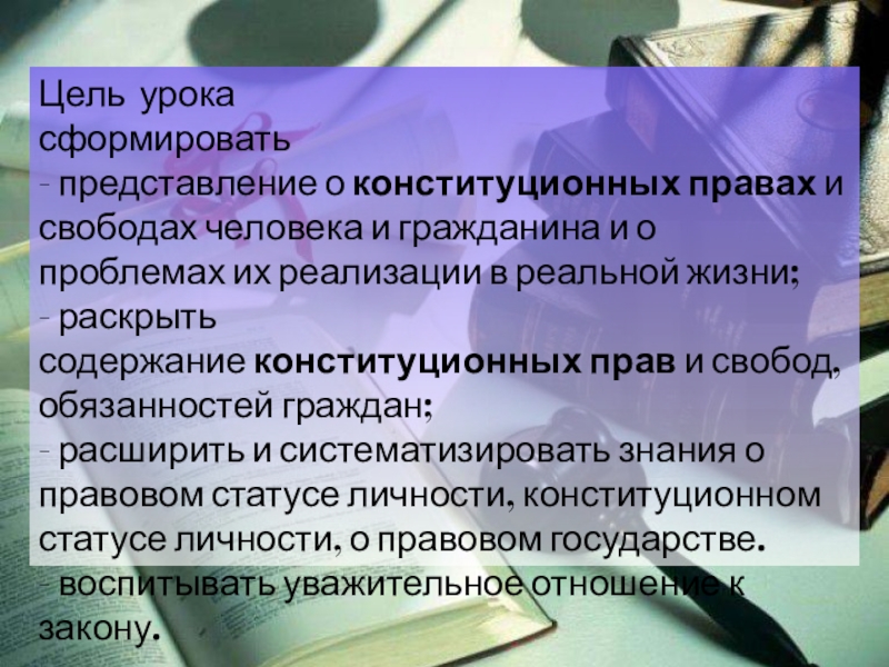 - расширить и систематизировать знания о правовом статусе личности, конституционном статусе личности, о правовом государстве.
