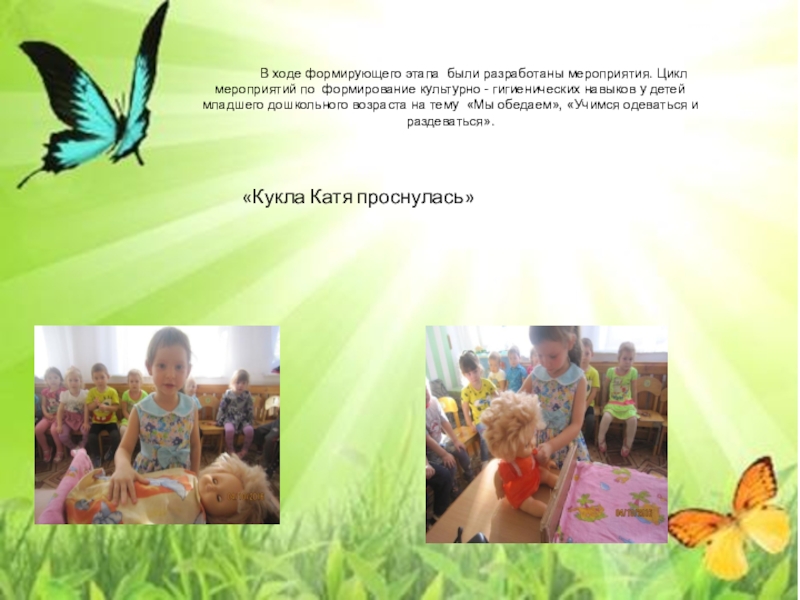 В ходе формирующего этапа были разработаны мероприятия. Цикл мероприятий по формирование культурно - гигиенических навыков у детей младшего дошкольного возраста на тему «Мы обедаем», «Учимся одеваться и раздеваться».