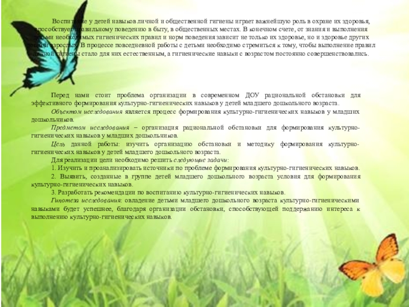 Объектом исследования является процесс формирования культурно-гигиенических навыков у младших дошкольников.