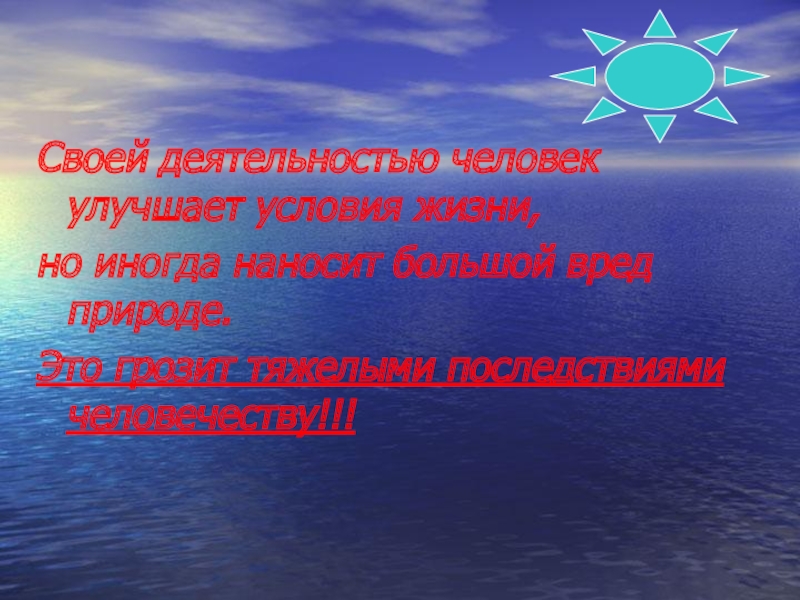 Своей деятельностью человек улучшает условия жизни,но иногда наносит большой вред природе.Это грозит тяжелыми последствиями человечеству!!!