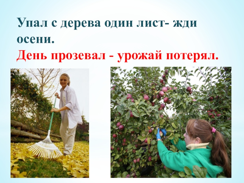 Упал с дерева один лист- жди осени.День прозевал - урожай потерял.