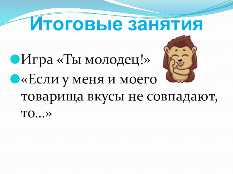 Итоговые занятияИгра «Ты молодец!»«Если у меня и моего товарища вкусы не совпадают, то…»