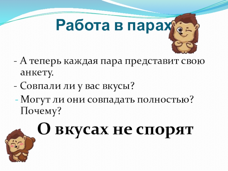Работа в парах- А теперь каждая пара представит свою анкету. - Совпали ли у вас вкусы? Могут
