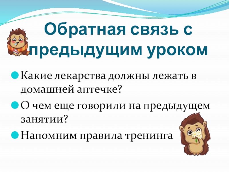 Обратная связь с предыдущим урокомКакие лекарства должны лежать в домашней аптечке?О чем еще говорили на предыдущем занятии?Напомним правила тренинга