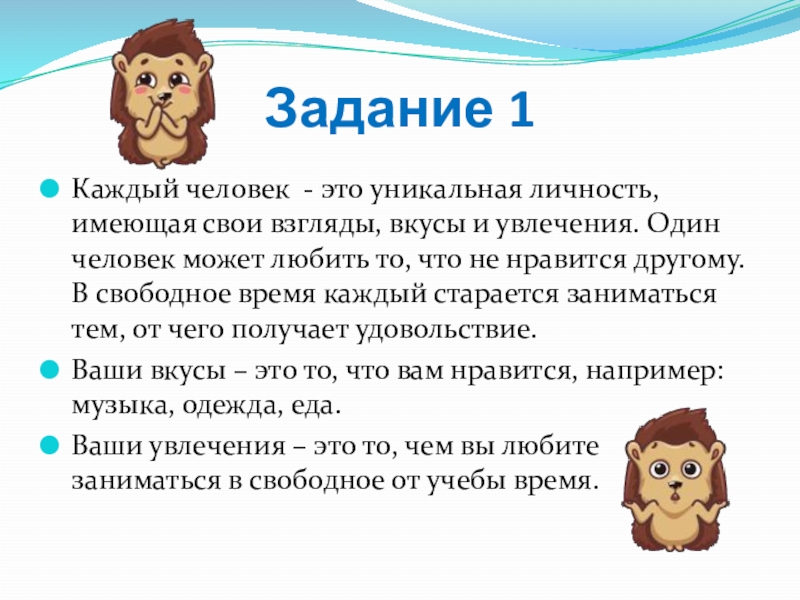 Задание 1Каждый человек - это уникальная личность, имеющая свои взгляды, вкусы и увлечения. Один человек может любить