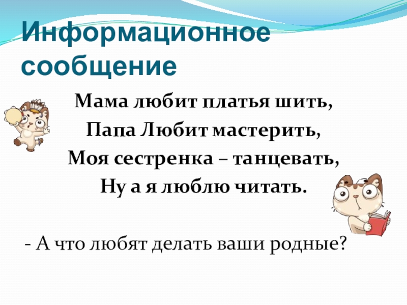 Информационное сообщениеМама любит платья шить,Папа Любит мастерить,Моя сестренка – танцевать,Ну а я люблю читать.- А что любят